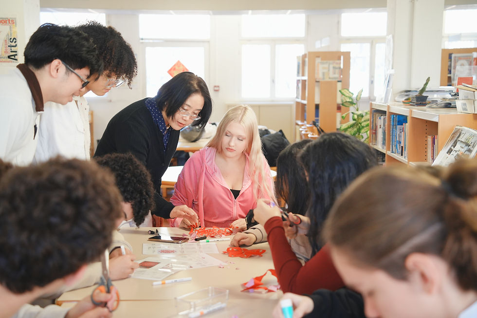 Lors de la partie pratique, les élèves ont été répartis en deux groupes : un groupe dédié aux éventails laqués et l’autre au papier découpé. Sous la direction des enseignantes et grâce à la pratique directe, chacun a pu créer une œuvre artistique unique. Dans le groupe de papier découpé, après avoir maîtrisé les techniques de base, les élèves ont pleinement laissé libre cours à leur imagination et à leur créativité, réalisant avec habileté des motifs tels que papillon et cœur. À la fin de l’atelier, tous ont posé ensemble pour une photo souvenir, fièrement munis de leurs créations.